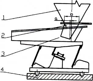 電磁振動給料機的振幅和給料量受料倉倉壓影響較大,設計料倉時應盡量減少倉壓,使溜咀后側(cè)板承受一定的倉壓,并設置斜溜沮及下料閘門。如圖,一般a=1/4b。溜咀四周應與給料槽留有一定的間隙,一般5~10mm,以免產(chǎn)生噪音及影響振動。